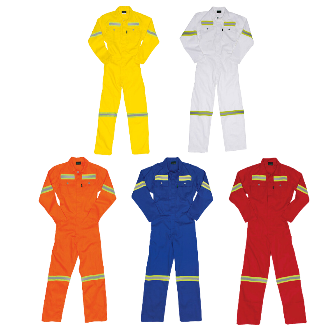 50mm lime and silver reflective tape around arms, legs, X on back and two strips across front · Chest pockets with riveted metal button down flaps.