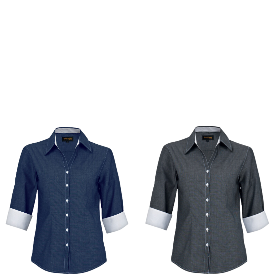 Ladies Onyx Blouse is made from 65/35 poly-cotton mélange weave fabric. Features include constructed v-shaped slimline button stand, innovative styling.