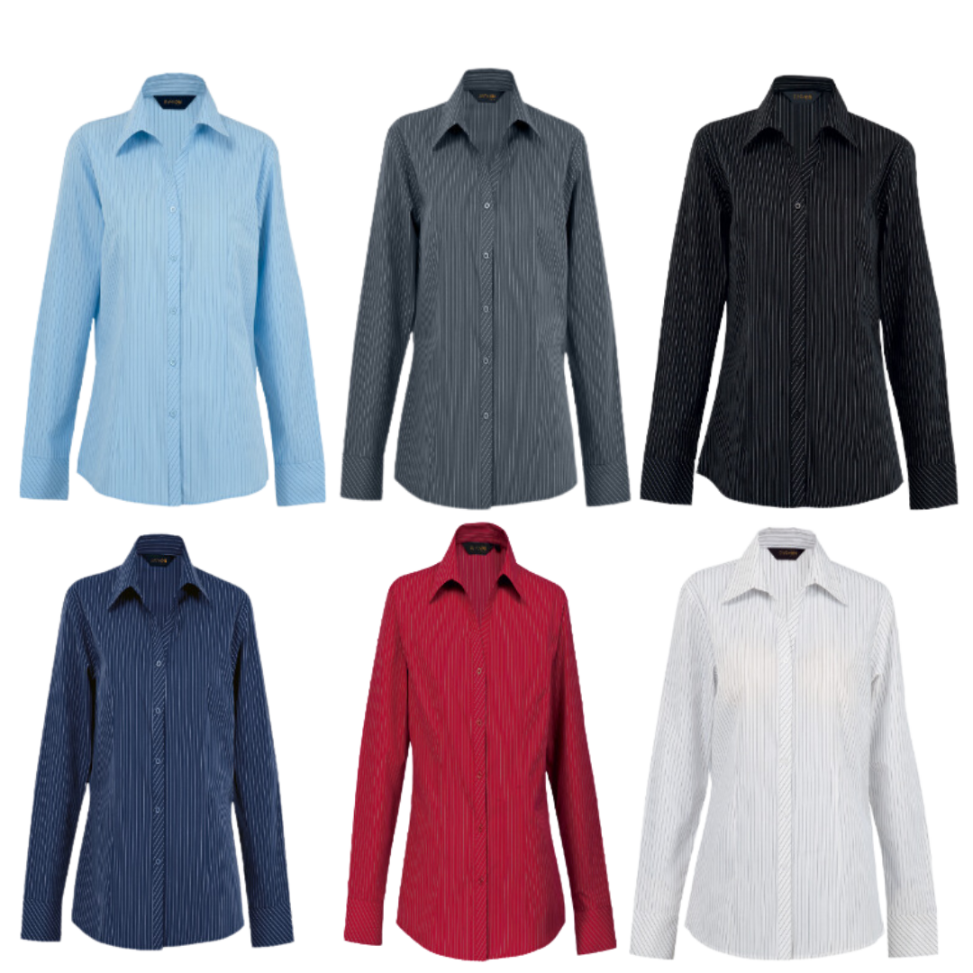 Ladies Quest Long Sleeve Blouse is made from 65/35 poly-cotton blended fabric with a subtle stripe design.